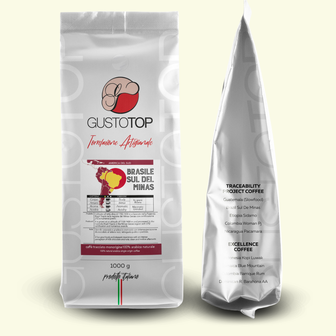 Coltivato all'altitudine di 1150-1400 mt e lavorato nella Fazenda Brazil Trapià nella regione del Minas Gerais, 100% arabica con certificazione UTZ e numerosi premi.