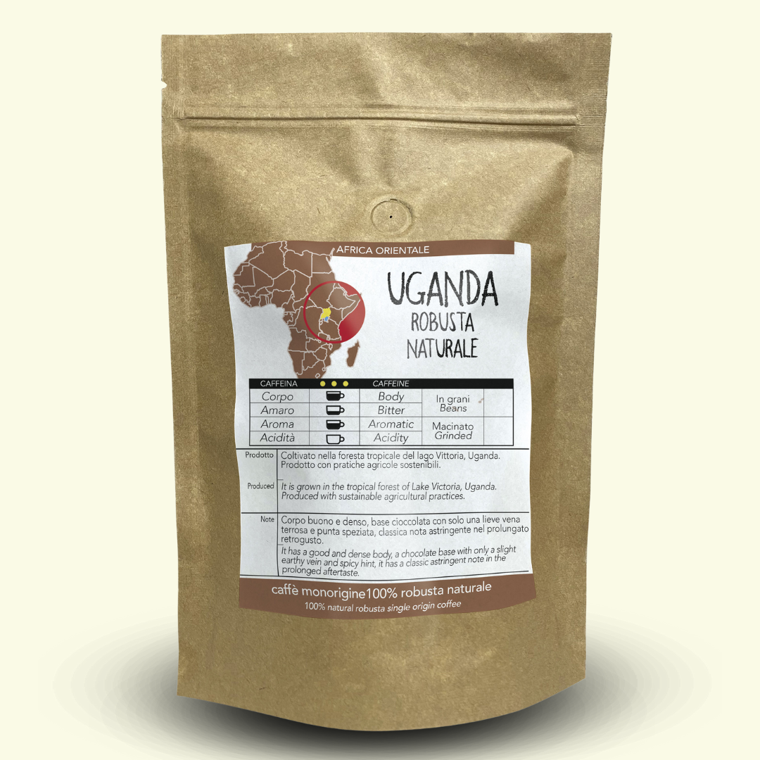 Questo caffè è coltivato nella foresta tropicale vicino al lago Vittoria, Uganda, 100% robusta monorigine. Viene prodotto attraverso pratiche agricole sostenibili che negli ultimi anni hanno migliorato e qualificato fortemente questa produzione sul mercato mondiale.