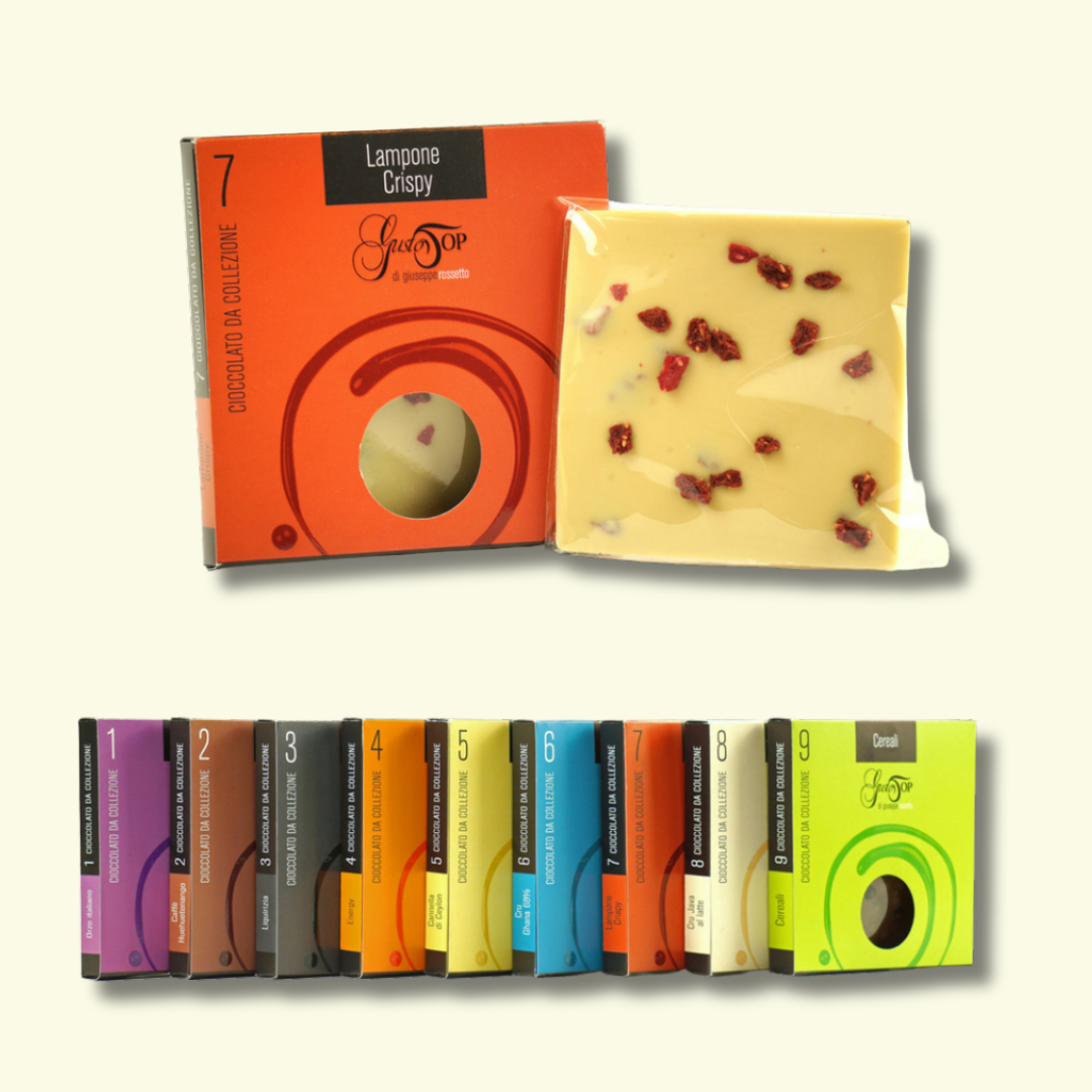 Cioccolato bianco ricco di croccanti e succosi lamponi. Il cosiddetto “oro rosso” è coltivato in Italia ed in Grecia dal XVI secolo; il suo habitat naturale è composto dai boschi e dalle zone collinari fino a 2.000 mt.