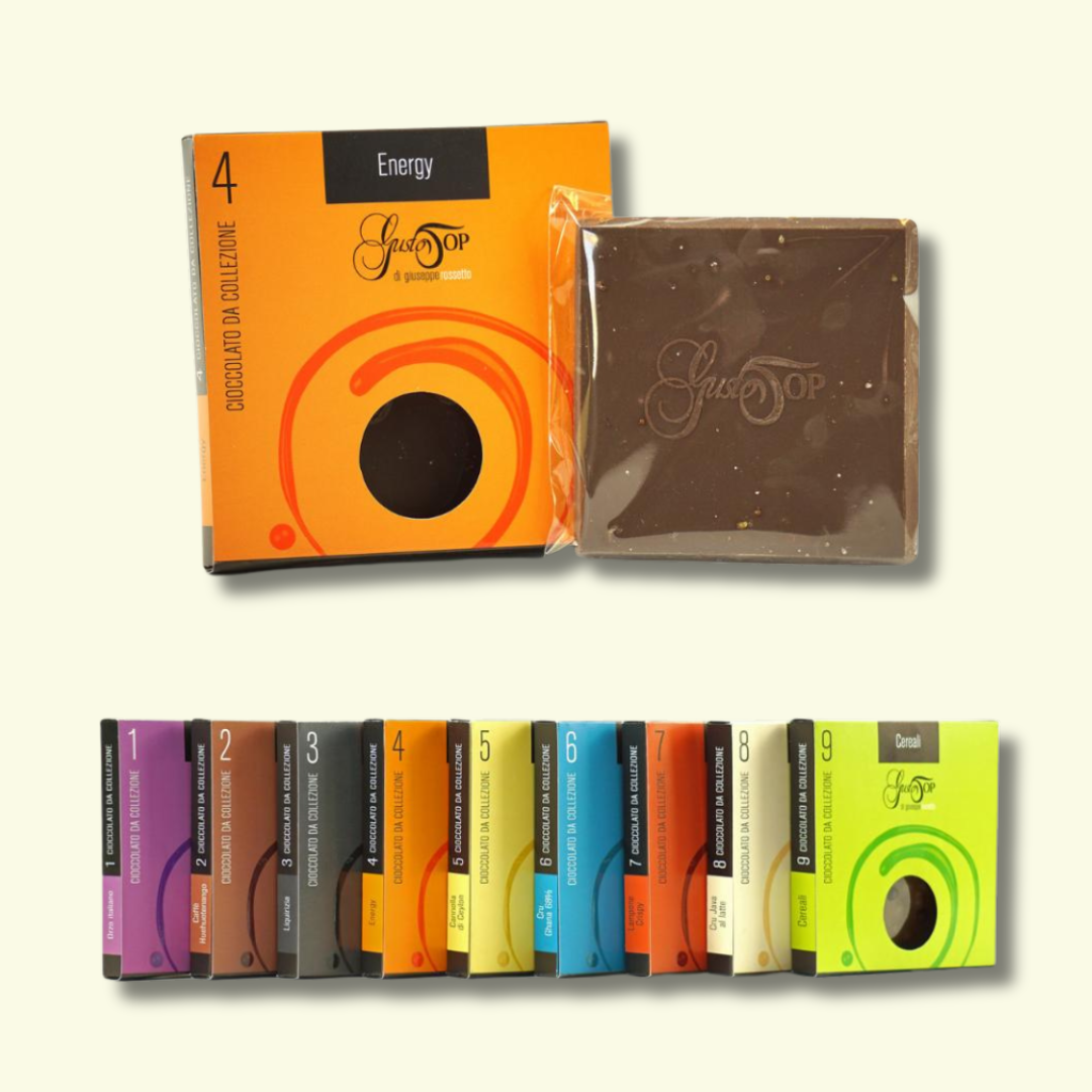 Degustazione: 45g di cioccolato fondente arricchito da un mix di spezie dall'inconfondibile gusto piccante ed amarognolo. L'assenzio è una pianta erbacea perenne dalle virtù toniche e protettive; il guaranà, frutto originario della regione brasiliana della' Amazzonia, è conosciuto per i suoi effetti energizzanti sull'organismo.